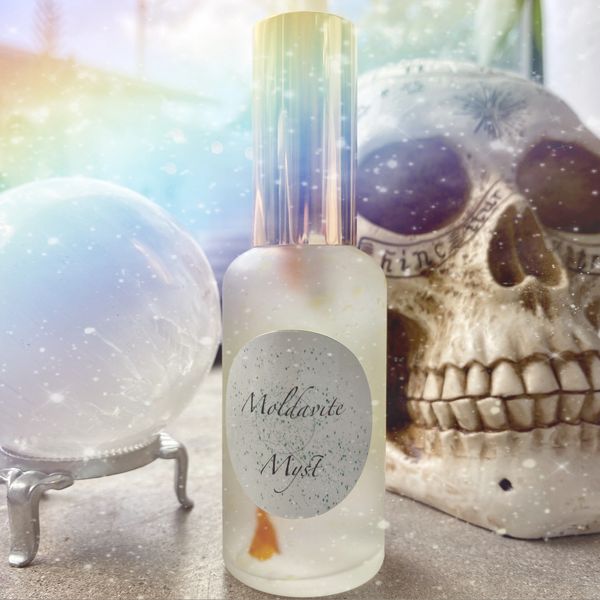 MOLDAVITE MYST for SCORPIO SEASON with CLOVE, FLOURITE CRYSTAL CHIPS, BERGAMOT and GRAPEFRUIT essential oils.